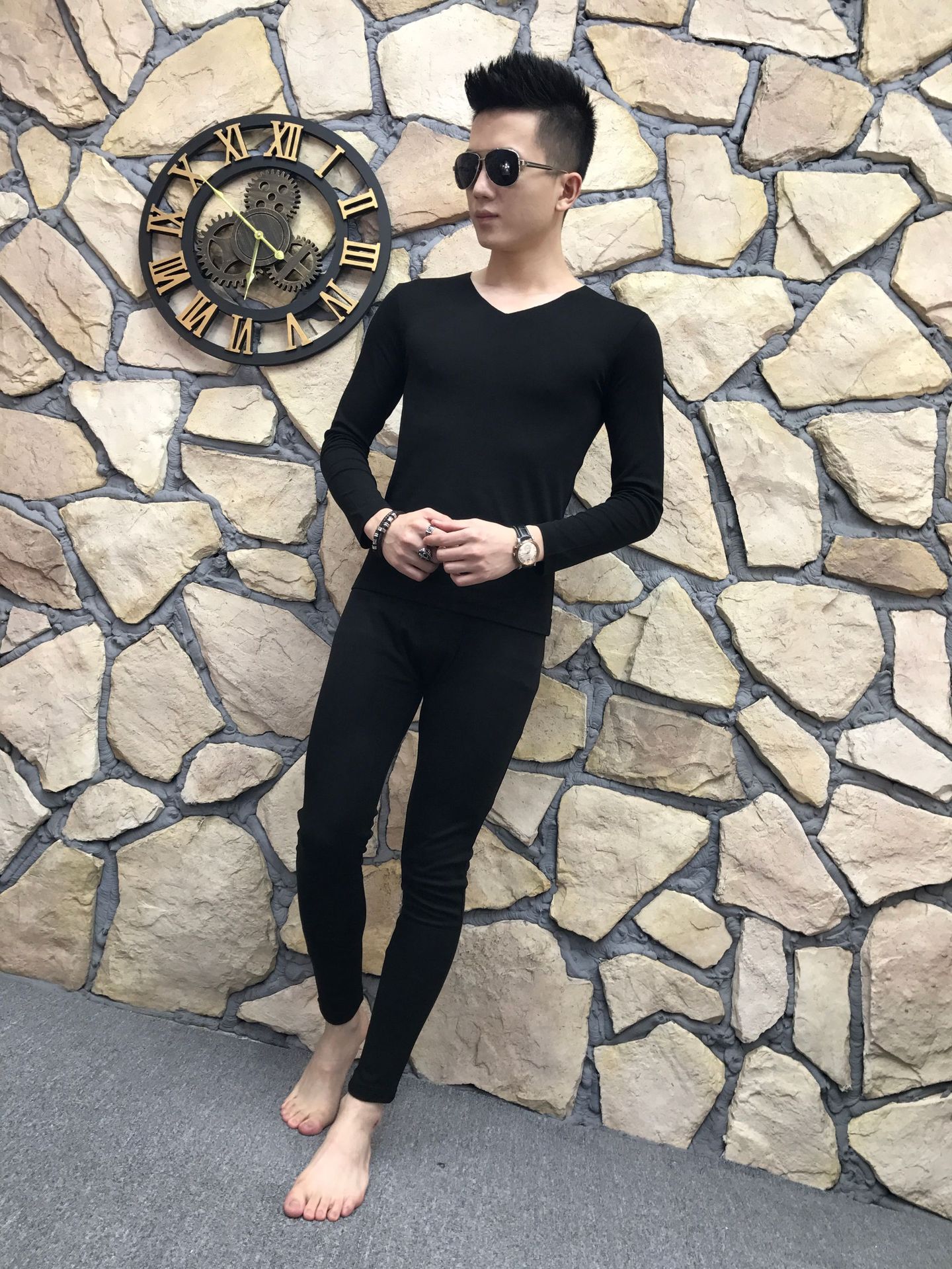 2018秋冬新款男士保暖内衣套装 莱卡纯色百搭V领柔软秋衣秋裤套装