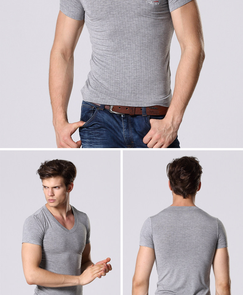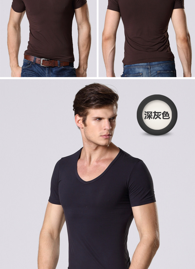 2件减10元 夏季男士内衣短袖背心纯色紧身v领莫代尔t恤打底衫汗衫 优