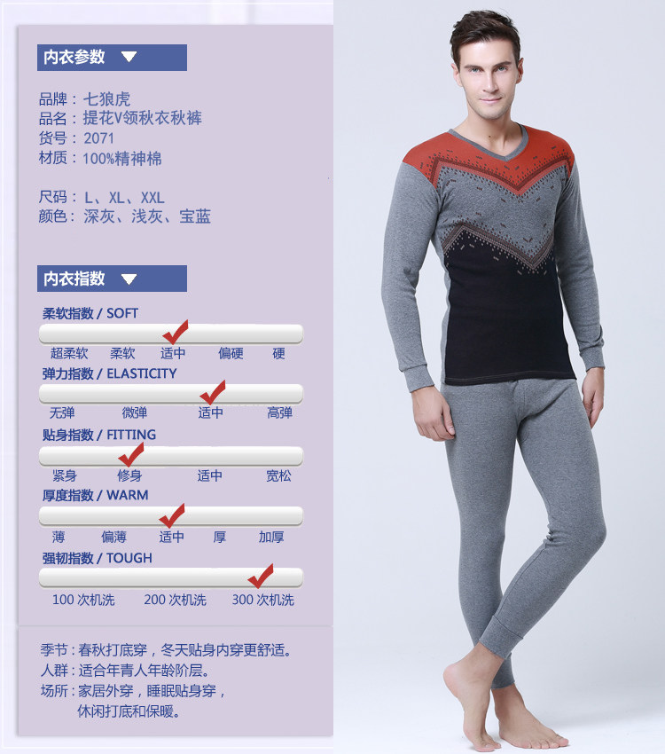 男士纯棉薄款V领保暖内衣套装