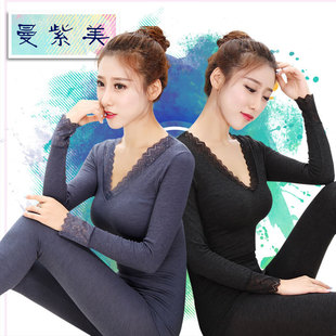 莫代尔保暖美体内衣无缝V领低胸蕾丝秋衣秋裤套装女士棉毛衫打底-